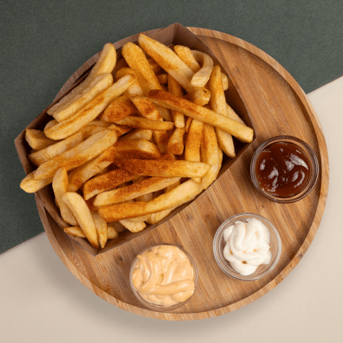 Fries, hummus or tahini, salad, grilled vegetables, pickles.