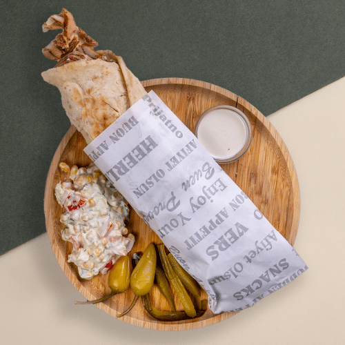 Grilled chicken, hummus, fries or salad, grilled vegetables, pickles.